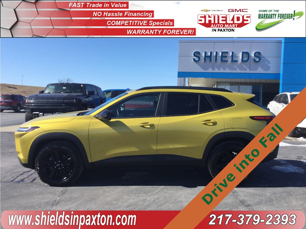 Passionate enthusiasts wanted for this dominant and agile 2024 Chevrolet Trax ACTIV. Savor silky smooth shifting from the Automatic transmission paired with this precision tuned Turbocharged Gas 3-Cyl 1.2L/ engine. With an incredible amount of torque, this vehicle deserves a passionate owner! It's loaded with the following options: WHEELS, 18 (45.7 CM) BLACK-PAINTED ALUMINUM (STD), TRANSMISSION, 6-SPEED AUTOMATIC (STD), SEATS, FRONT BUCKET (STD), NITRO YELLOW METALLIC, LPO, ALL-WEATHER FLOOR LINERS, FRONT AND REAR Jet Black., LICENSE PLATE FRONT MOUNTING PACKAGE, JET BLACK WITH YELLOW ACCENTS, EVOTEX SEAT TRIM, ENGINE, ECOTEC 1.2L TURBO DOHC DI WITH VARIABLE VALVE TIMING (VVT) (137 hp [102 kW] @ 5000 rpm, 162 lb-ft of torque [219 N-m] @ 2500 rpm) (STD), AXLE, 3.50 FINAL DRIVE RATIO, and AUDIO SYSTEM, 11 DIAGONAL HD COLOR TOUCHSCREEN AM/FM stereo. Additional features for compatible phones include: Bluetooth audio streaming for 2 active devices, voice command pass-through to phone, wireless Apple CarPlay and wireless Android Auto capable (STD). Find excuses for road trips in this spirited and whimsical Chevrolet Trax. Visit Shields Auto Mart located at 580 John St, Paxton, IL 60957 for a hassle-free deal!